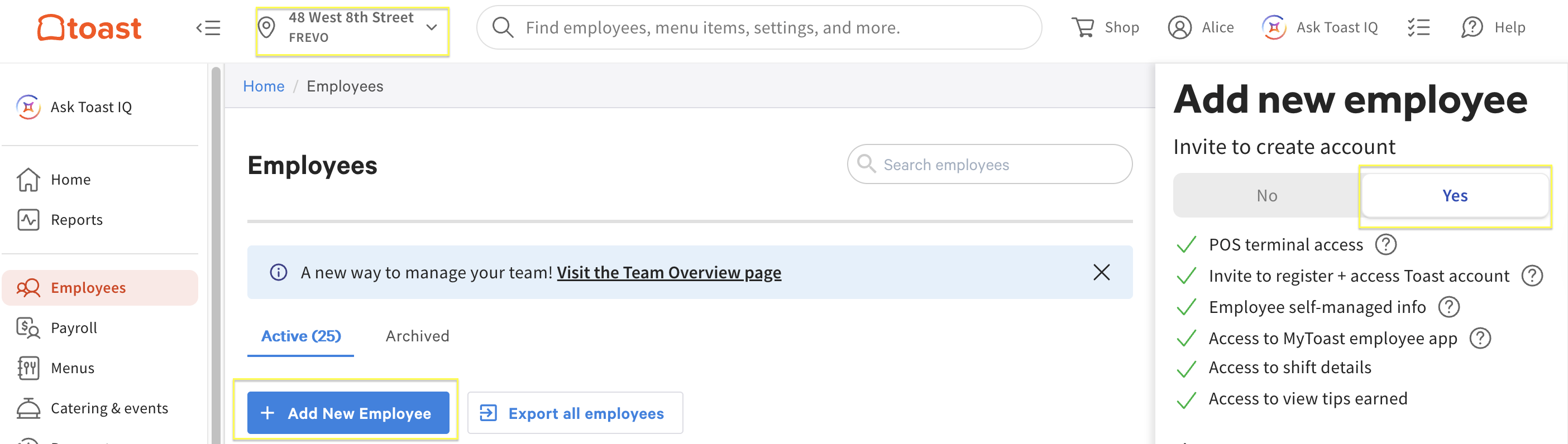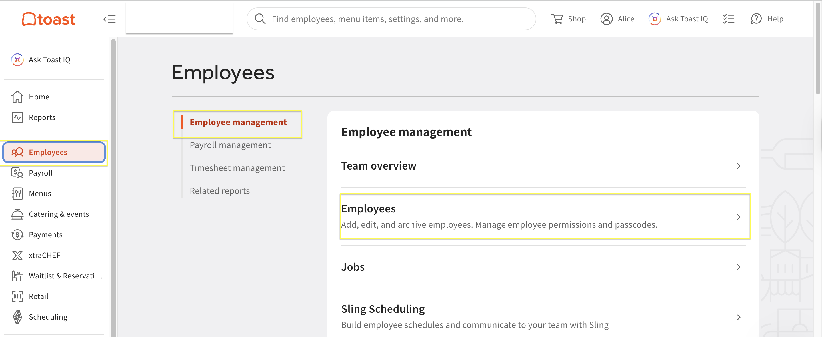 Log in to your Toast POS system and navigate to: Employees > Employee Management > Employees