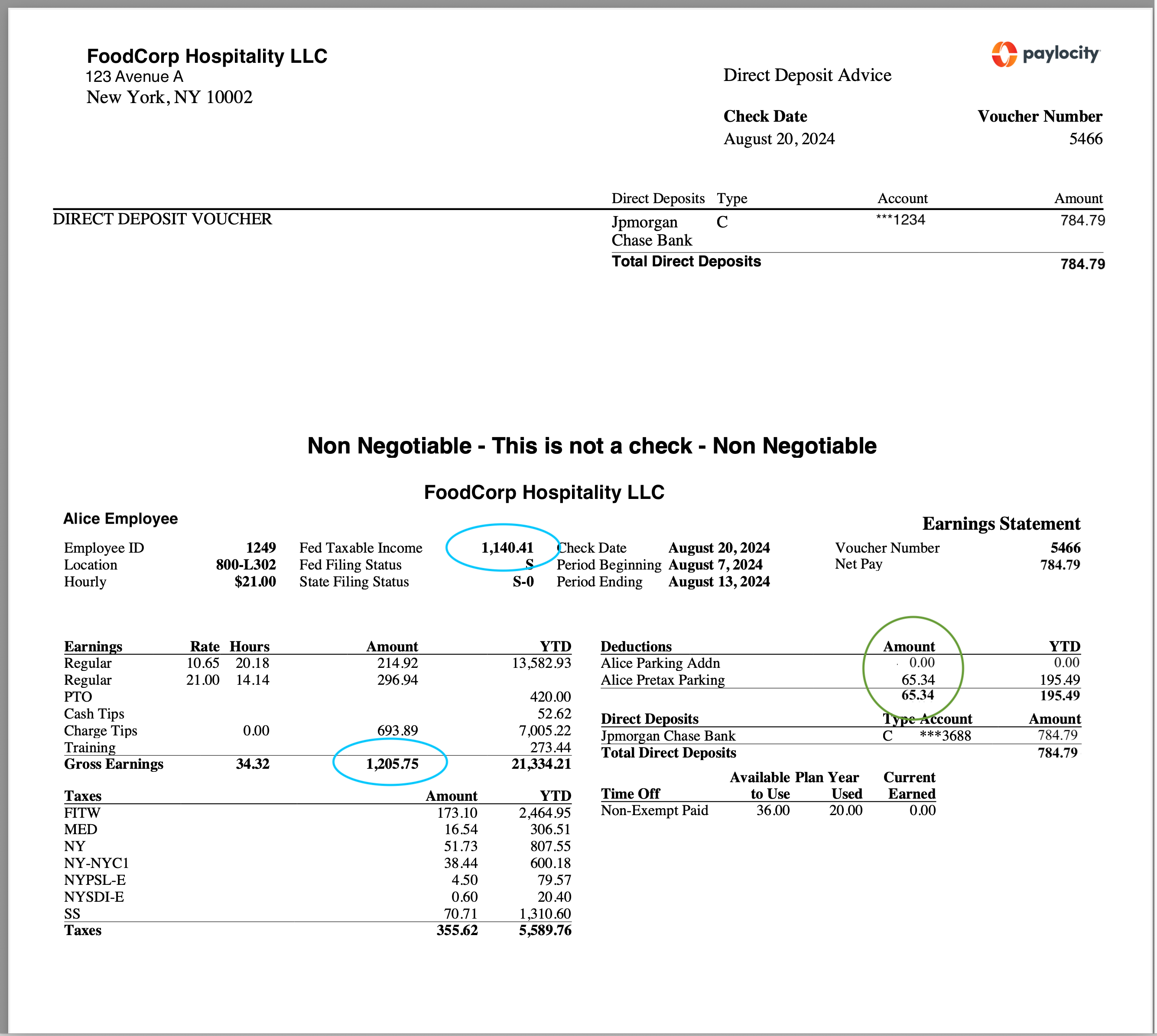 - Because they spent $65.34 on parking with their own card, Alice ran a matching $65.34 reimbursement (which Paylocity here calls an "Addn" and shows as negative) and $65.34 deduction. Comparing the values in blue, you can see their Fed Taxable Income is exactly $65.34 less than their Gross Earnings.