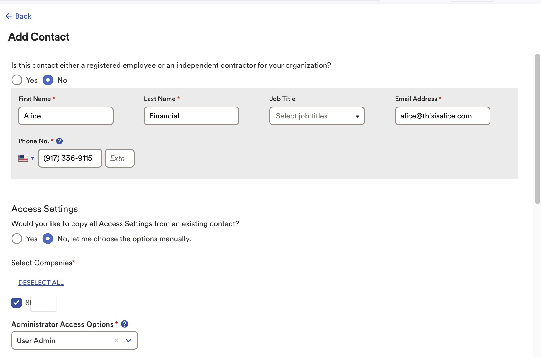 The phone number and email address provided above are for setting up Alice's access level in payroll only and not for contacting Alice for support. Please enter them exactly as provided above.