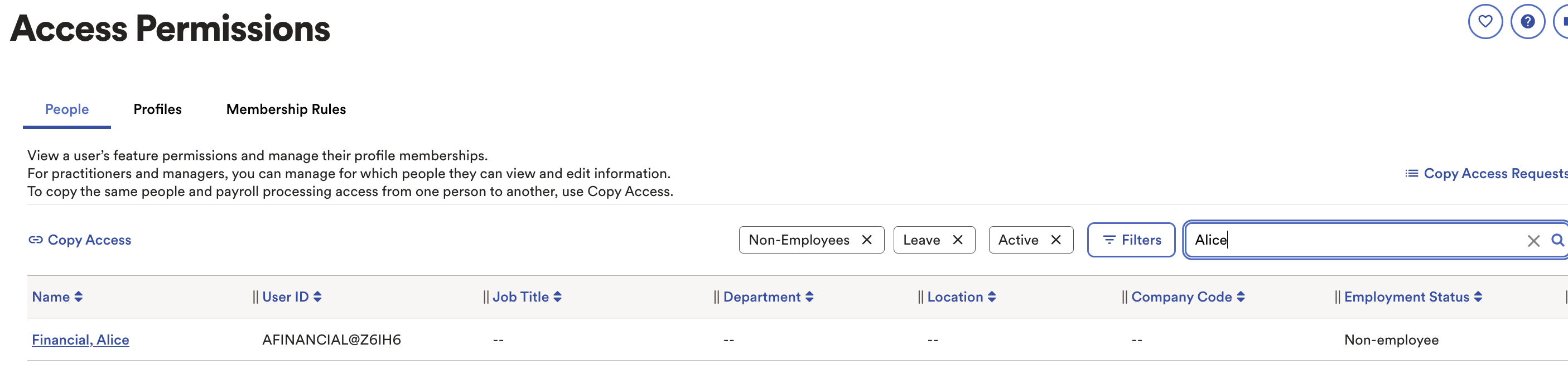 Navigate to the Financial, Alice non-employee account you created. Note: If you are having a hard time locating the account, ensure the "Filters" is not set to exclude non-employees